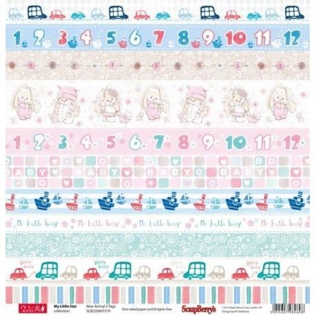 Papel de scrapbooking de 2 caras impresas con motivos navideños: habitación con juguetes y animales sobre fondo azul.
