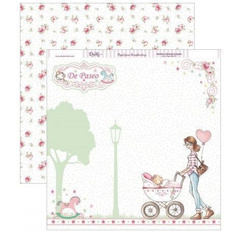 Colección "Y por fin llegaste Tú, mi niña" de Dayka Trade. Diseño por las dos caras: a. cartel "de paseo", mamá paseando con el bebé en su carrito; b. fondo de flores. Diseñado y hecho en España. Papel, de 224 gr, libre de ácidos y ligninas.